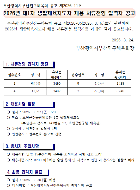 2026년 제1차 생활체육지도자 채용 서류전형 합격자 공고 페이지 정보 작성일 26-03-24 16:53 본문 목록 답변 이전글2026년 제1차 생활체육지도자 채용 최종 합격자 공고 26.03.30 다음글2026년 제1차 생활체육지도자 채용 계획 공고 26.03.06